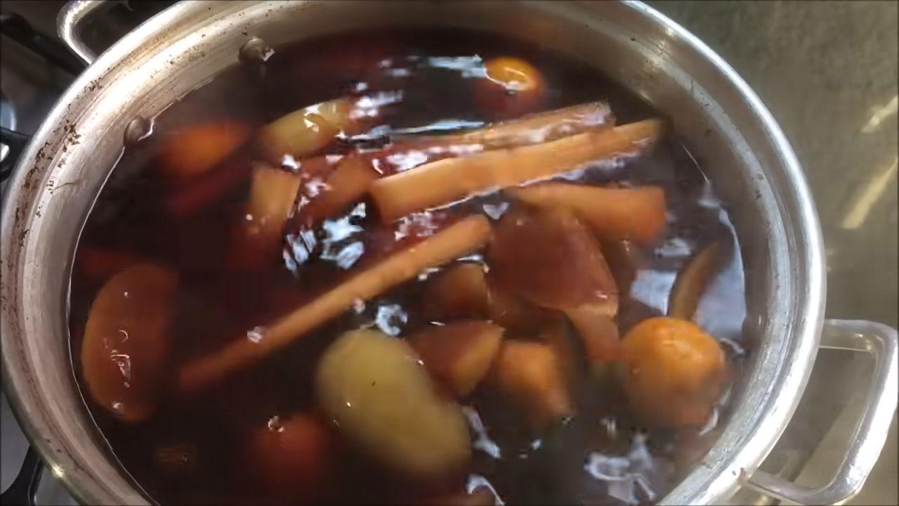 - En una cacerola grande, calienta agua con az煤car, canela y piloncillo. A帽ade los tejocotes y la ca帽a.