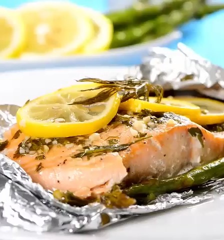 - Coloca el salmón en un plato y agrega los espárragos encima.
